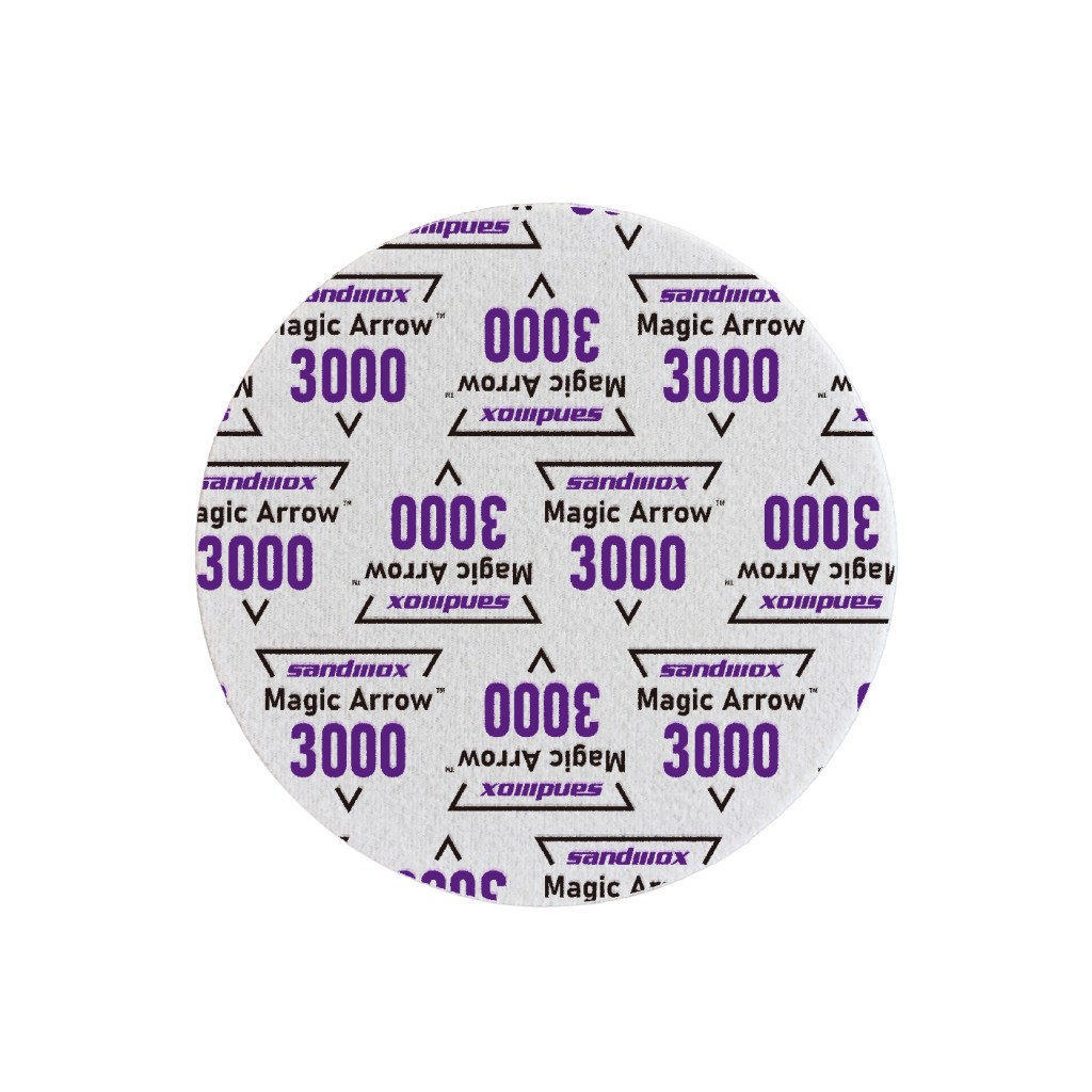 Sandwox magic arrow finishing sanding disc was built with special-designed three-dimensional structure abrasives which are engineered for consistent cut and long life. They can wear to reveal fresh, sharp abrasive mineral. Our magic arrow finishing sanding discs are used to remove 2000 grade sanding scratches and help you to spend less time compounding.